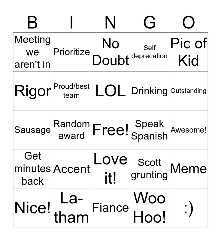 This bingo card has a free space and 24 words: Accent, La-tham, LOL, Nice!, Pic of Kid, Meeting we aren't in, Rigor, Prioritize, Speak Spanish, Love it!, Drinking, Sausage, Scott grunting, Meme, Proud/best team, Woo Hoo!, Awesome!, No Doubt, Outstanding, Random award, :), Get minutes back, Self deprecation and Fiance.