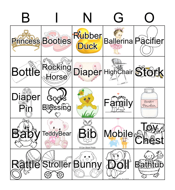 This bingo card has 24 images, a free space and 23 words: TeddyBear, Stroller, Diaper, Rattle, Pacifier, Princess, Bottle, Booties, Family, Bib, HighChair, Diaper Pin, Mobile, Toy Chest, Rocking Horse, Doll, Rubber Duck, Stork, God's Blessing, Bathtub, Baby, Ballerina and Bunny.
