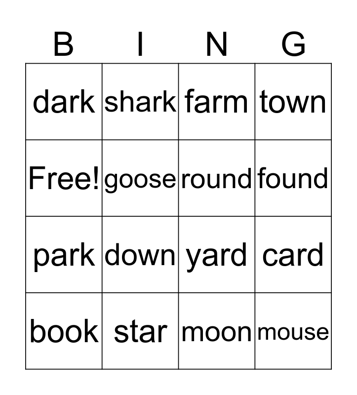 This bingo card has 16 words: star, card, farm, dark, park, shark, yard, moon, Free!, goose, book, town, down, found, round and mouse.