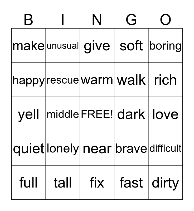 This bingo card has a free space and 24 words: lonely, tall, warm, full, boring, make, happy, unusual, dark, near, walk, yell, brave, difficult, rescue, fast, love, give, rich, middle, dirty, quiet, soft and fix.