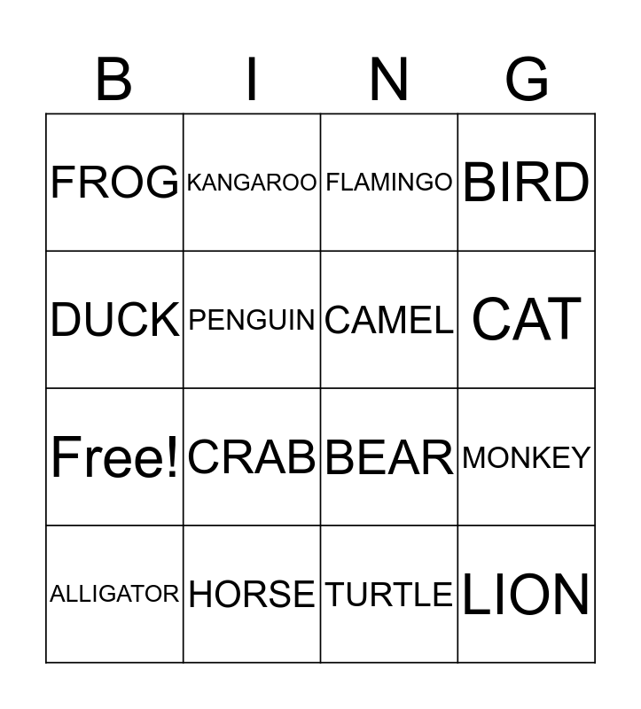 This bingo card has 20 words: MONKEY, ELEPHANT, FLAMINGO, SNAKE, ALLIGATOR, DUCK, HORSE, FROG, Free!, KANGAROO, CRAB, BEAR, PENGUIN, LION, CAMEL, SEAL, CAT, BIRD, TURTLE and BUNNY.