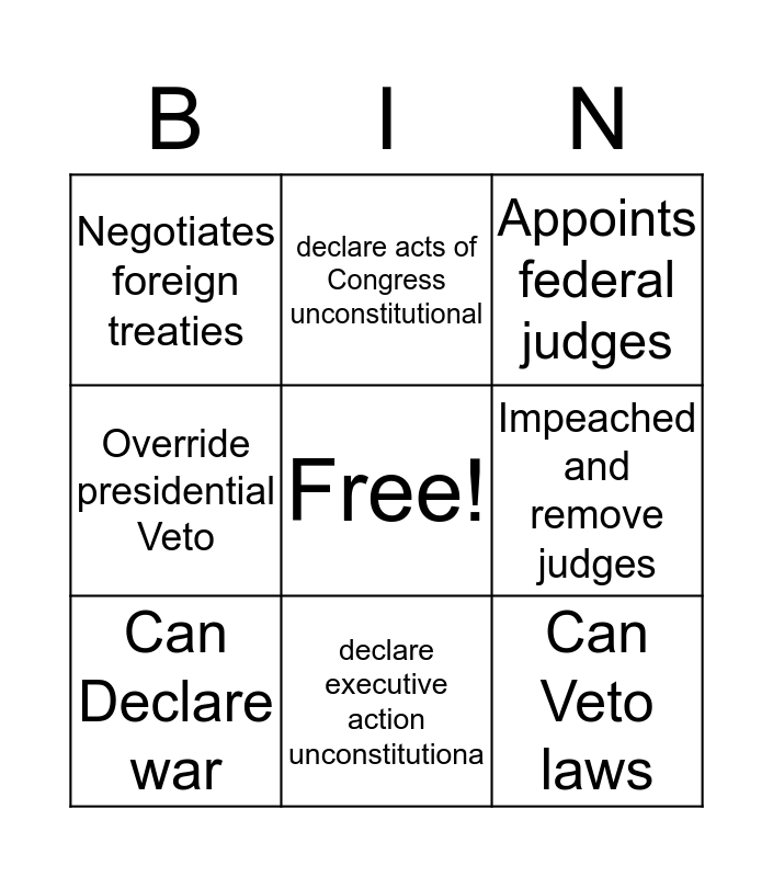 This bingo card has a free space and 8 words: Impeached and remove judges, Appoints federal judges, declare acts of Congress unconstitutional, Can Declare war, Negotiates foreign treaties, Can Veto laws, Override presidential Veto and declare executive action unconstitutiona.