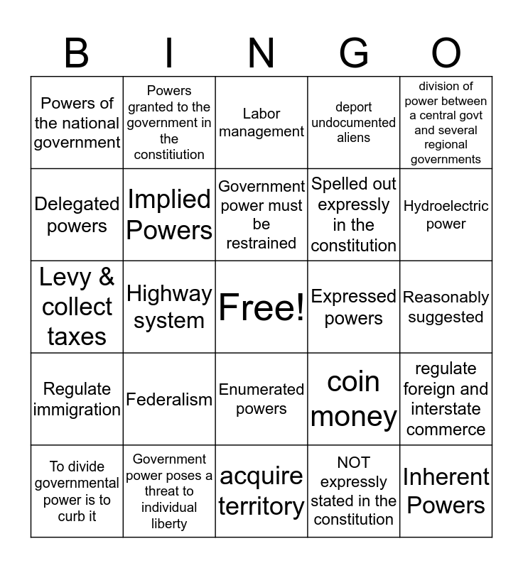 This bingo card has a free space and 24 words: Federalism, Government power poses a threat to individual liberty, Government power must be restrained, To divide governmental power is to curb it, division of power between a central govt and several regional governments, Powers of the national government, Delegated powers, Powers granted to the government in the constitiution, Expressed powers, Enumerated powers, Spelled out expressly in the constitution, Levy & collect taxes, coin money, regulate foreign and interstate commerce, Implied Powers, NOT expressly stated in the constitution, Reasonably suggested, Labor management, Hydroelectric power, Highway system, Inherent Powers, Regulate immigration, deport undocumented aliens and acquire territory.