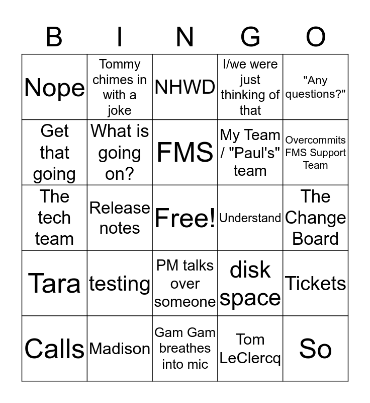 This bingo card has a free space and 59 words: Scott, Madison, Jess, Tara, Tom LeClercq, John Robinson, What is going on?, Anything Else, My Team / "Paul's" team, PDC, I/we were just thinking of that, mhmm, Get that going, Make it/that happen, Actually, Nope, So, "Any questions?", STL, FMS, Understand, NHWD, Calls, Tickets, Support, Cherwell, WTL/ "the west", Inappropriately agrees to whatever was asked, Overcommits FMS Support Team, Fumbles handoff between Paul/Vicki, Awkward dispute, Dodges PDC backlog, Rambling, Talks about the call itself, Tommy chimes in with a joke, Misrepresents understanding, States a job title, Release notes, "In RMS...", The tech team, The Steering Committee, testing, The Change Board, Overcommits Stephen Alberty, Awkward moment, "Hi, this is Molly...", Rusty Nance, Miscommunicates geographical area, PM talks over someone, Gam Gam breathes into mic, ArcMap, CWS, Trimble, SQL, streams/ hydrology lines, disk space, PM left hanging by everyone else on call, TL saves the day and SS.