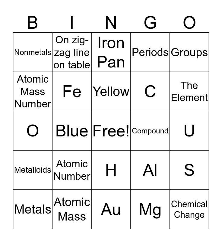 This bingo card has a free space and 24 words: Atomic Number, Atomic Mass, Yellow, Metals, Groups, Nonmetals, Atomic Mass Number, On zig-zag line on table, Compound, H, C, O, Al, S, Fe, Mg, U, Iron Pan, The Element, Blue, Chemical Change, Metalloids, Periods and Au.
