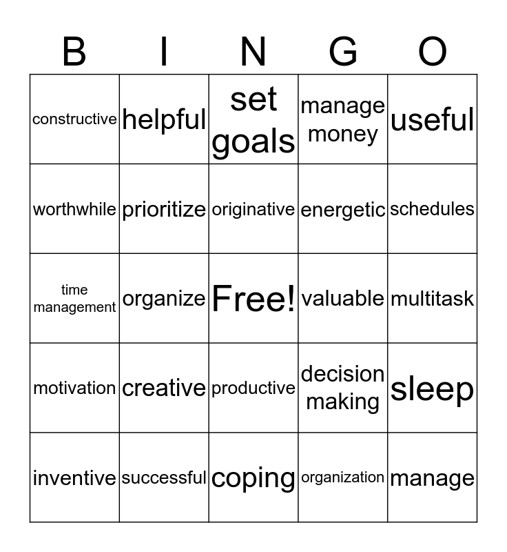 This bingo card has a free space and 24 words: creative, successful, originative, inventive, useful, constructive, worthwhile, helpful, valuable, productive, energetic, time management, decision making, sleep, prioritize, organization, multitask, set goals, schedules, organize, manage, motivation, manage money and coping.