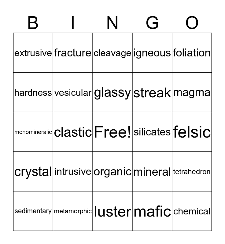 This bingo card has a free space and 27 words: mineral, color, streak, luster, hardness, cleavage, fracture, crystal, silicates, tetrahedron, monomineralic, igneous, sedimentary, metamorphic, magma, lava, vesicular, glassy, intrusive, extrusive, felsic, mafic, clastic, chemical, organic, foliation and rock cycle.