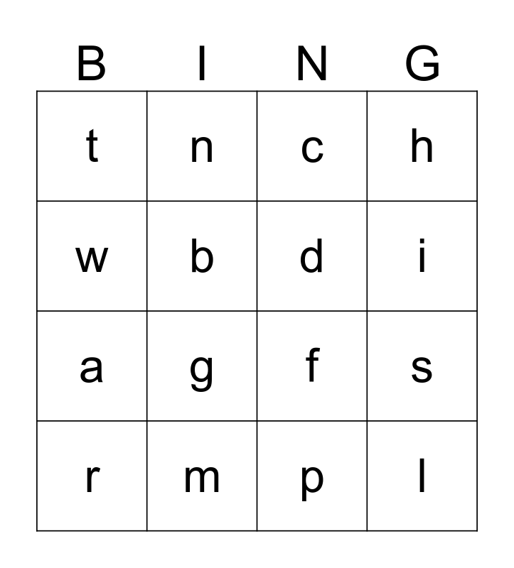 This bingo card has 16 words: m, s, c, t, a, n, f, p, w, b, r, h, g, i, d and l.