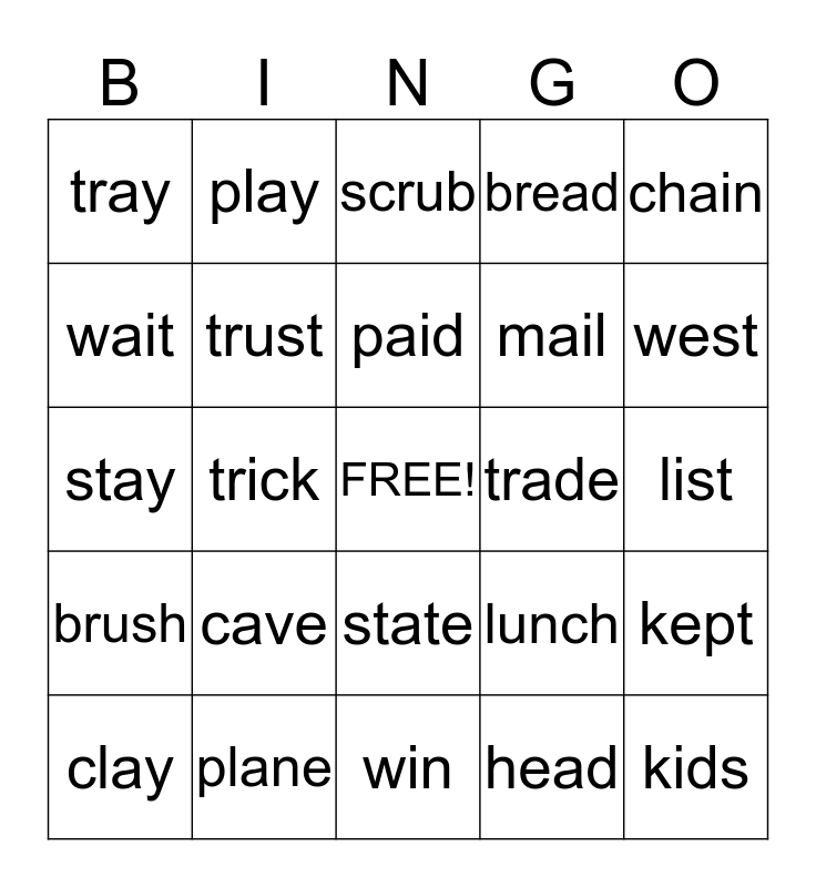 This bingo card has a free space and 24 words: cave, plane, paid, clay, chain, tray, wait, play, trade, state, mail, stay, lunch, kept, trust, head, list, scrub, west, trick, kids, brush, bread and win.