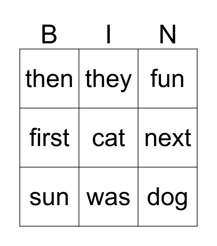 This bingo card has 9 words: sun, fun, they, first, then, next, cat, dog and was.