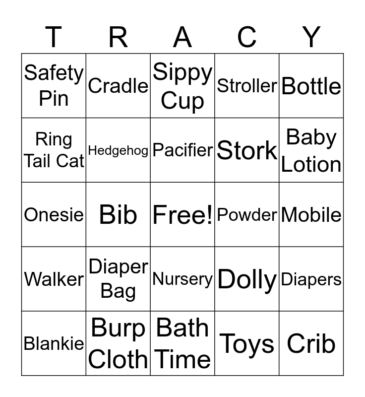 This bingo card has a free space and 38 words: Raccoon, Deer, Fox, Hedgehog, Diapers, Diaper Bag, Pacifier, Squirrel, Bottle, Stork, Bib, Stroller, Crib, Mobile, Ring Tail Cat, Walker, Bassinet, Sippy Cup, Swing, Powder, Safety Pin, Burp Cloth, Baby Lotion, Blankie, Teether, Bath Time, Baby Food, Rubber Ducky, High Chair, Car Seat, Rattle, Nursery, Toys, Cradle, Teddy Bear, Dolly, Onesie and Booties.