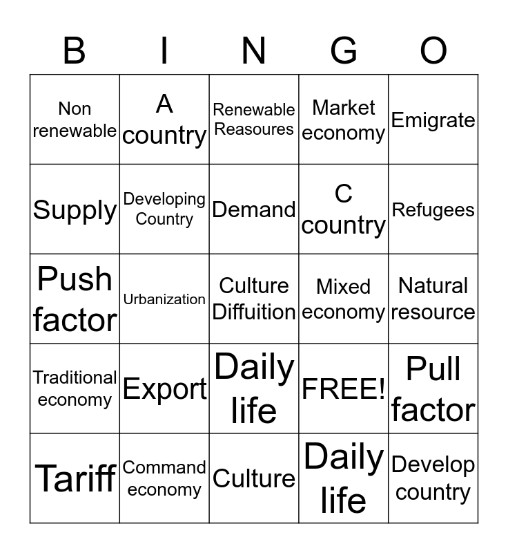 This bingo card has 25 words: Export, Culture, Demand, Tariff, Emigrate, Non renewable, Supply, A country, Mixed economy, Daily life, C country, Push factor, FREE!, Pull factor, Developing Country, Develop country, Natural resource, Renewable Reasoures, Refugees, Urbanization, Culture Diffuition, Command economy, Traditional economy, Market economy and Daily life.