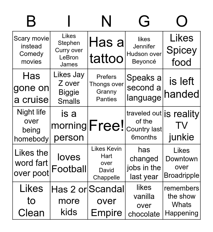 This bingo card has a free space and 24 words: loves Football, Has 2 or more kids, Prefers Thongs over Granny Panties, Likes to Clean, Likes Spicey food, Scary movie instead Comedy movies, Has gone on a cruise, Likes Stephen Curry over LeBron James, traveled out of the Country last 6months, Likes Kevin Hart over David Chappelle, Speaks a second a language, Night life over being homebody, has changed jobs in the last year, Likes Downtown over Broadripple, Likes Jay Z over Biggie Smalls, likes vanilla over chocolate, is reality TV junkie, Has a tattoo, is left handed, is a morning person, remembers the show Whats Happening, Likes the word fart over poot, likes Jennifer Hudson over Beyoncé and Scandal over Empire.