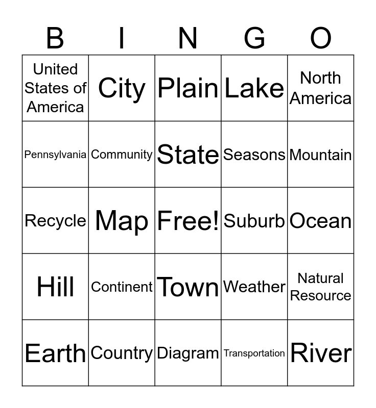 This bingo card has a free space and 24 words: Continent, Country, State, Earth, North America, United States of America, Pennsylvania, City, Suburb, Town, Seasons, Recycle, Weather, Natural Resource, Community, Transportation, Ocean, Plain, Mountain, Map, River, Hill, Lake and Diagram.