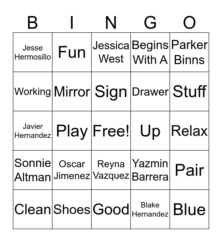 This bingo card has a free space and 24 words: Oscar Jimenez, Shoes, Sign, Clean, Parker Binns, Jesse Hermosillo, Working, Fun, Up, Reyna Vazquez, Drawer, Javier Hernandez, Yazmin Barrera, Pair, Mirror, Blake Hernandez, Relax, Jessica West, Stuff, Play, Blue, Sonnie Altman, Begins With A and Good.