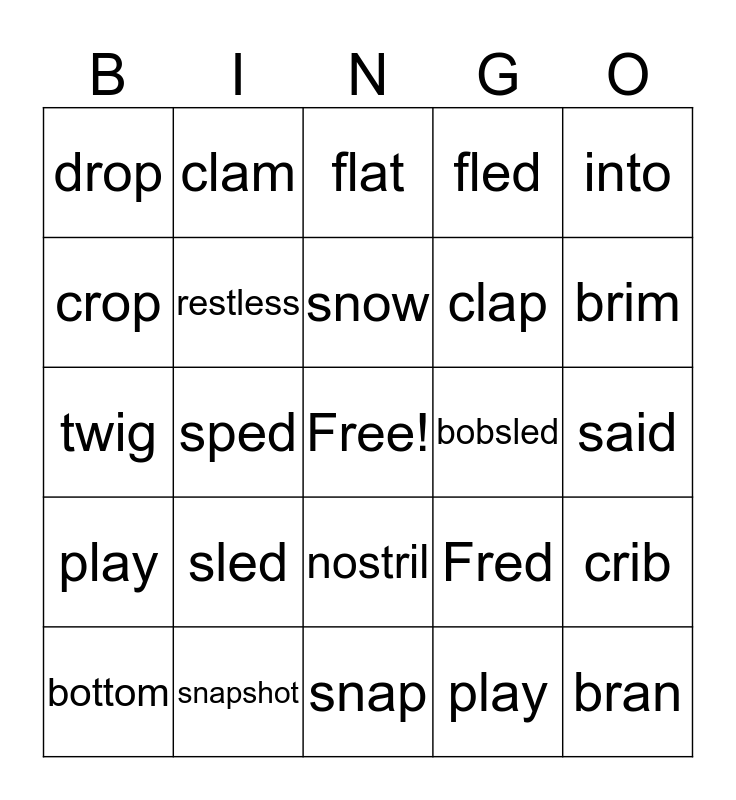 This bingo card has a free space and 24 words: sled, snapshot, snow, bottom, into, drop, crop, clam, bobsled, nostril, clap, twig, Fred, crib, restless, play, said, flat, brim, sped, bran, play, fled and snap.