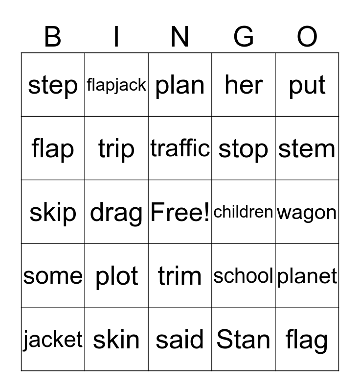 This bingo card has a free space and 24 words: plot, skin, traffic, jacket, put, step, flap, flapjack, children, trim, stop, skip, school, planet, trip, Stan, wagon, plan, stem, drag, flag, some, her and said.