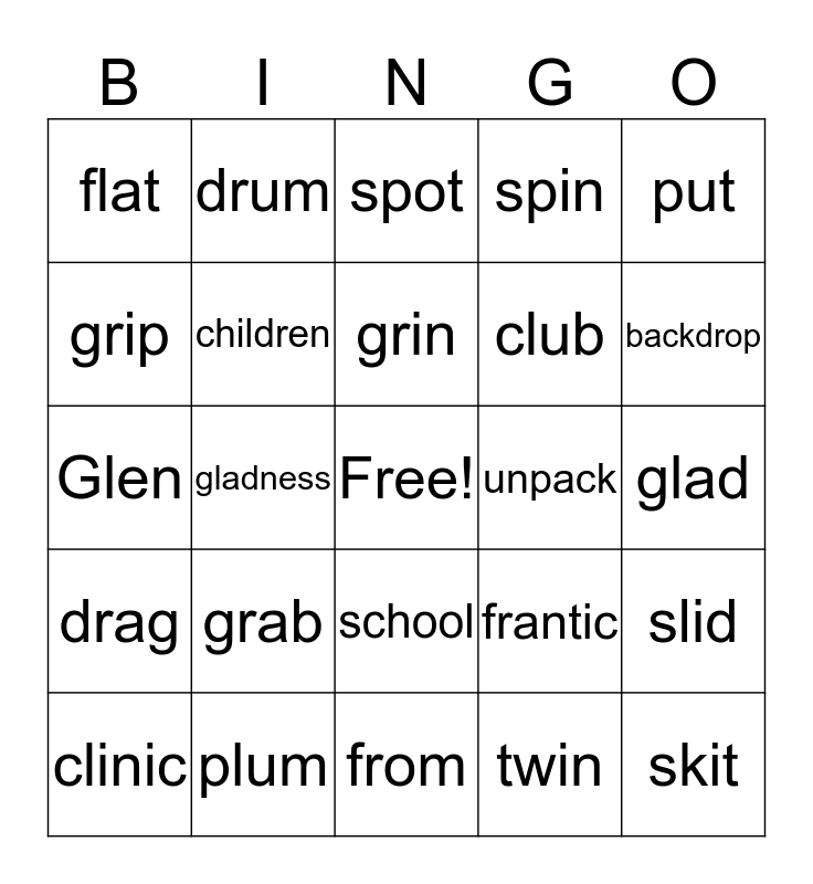 This bingo card has a free space and 24 words: grab, plum, grin, clinic, put, flat, grip, drum, unpack, school, club, Glen, frantic, slid, children, twin, glad, spot, backdrop, gladness, skit, drag, spin and from.