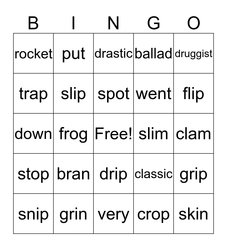 This bingo card has a free space and 24 words: bran, grin, spot, snip, druggist, rocket, trap, put, slim, drip, went, down, classic, grip, slip, crop, clam, drastic, flip, frog, skin, stop, ballad and very.