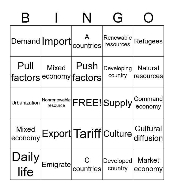 This bingo card has a free space and 24 words: Export, Emigrate, Push factors, Daily life, Refugees, Demand, Pull factors, Import, Supply, Tariff, Developing country, Urbanization, Culture, Cultural diffusion, Mixed economy, Developed country, Command economy, A countries, Natural resources, Nonrenewable resource, Market economy, Mixed economy, Renewable resources and C countries.