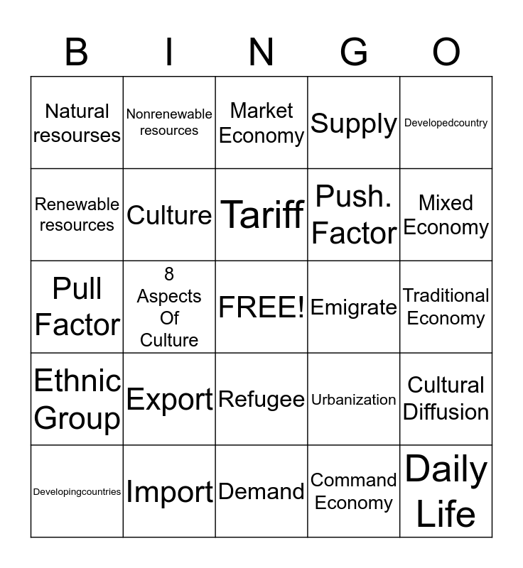 This bingo card has a free space and 24 words: Export, Import, Tariff, Developingcountries, Developedcountry, Natural resourses, Renewable resources, Nonrenewable resources, Emigrate, Refugee, Push. Factor, Pull Factor, Urbanization, Cultural Diffusion, Culture, Command Economy, Traditional Economy, Market Economy, Mixed Economy, 8 Aspects Of Culture, Daily Life, Ethnic Group, Supply and Demand.