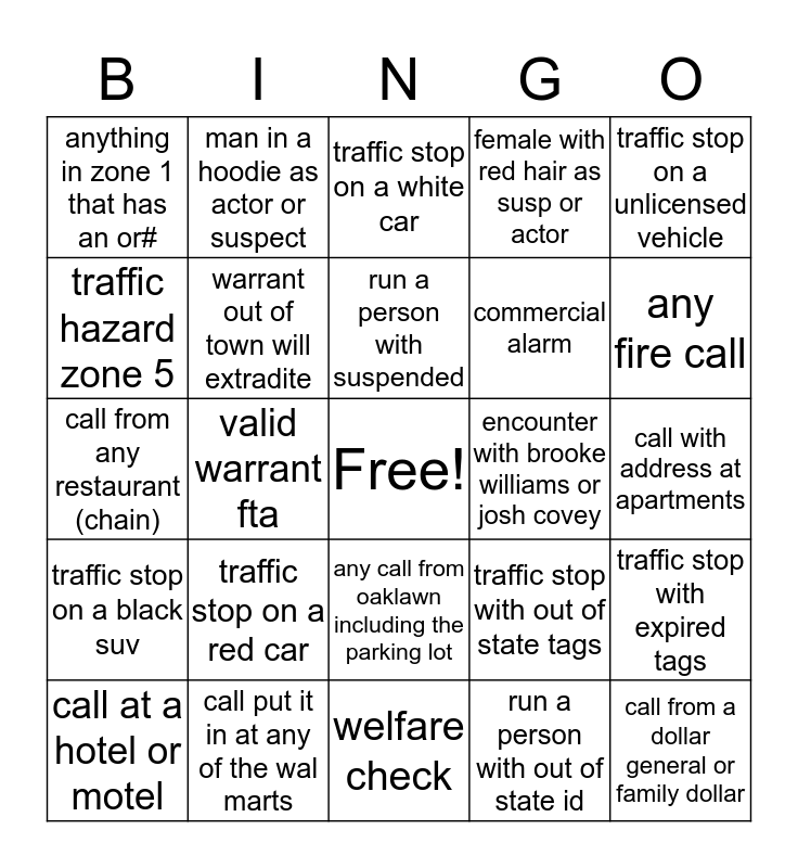 This bingo card has a free space and 24 words: traffic stop on a red car, call put it in at any of the wal marts, run a person with suspended, call at a hotel or motel, traffic stop on a unlicensed vehicle, anything in zone 1 that has an or#, traffic hazard zone 5, man in a hoodie as actor or suspect, encounter with brooke williams or josh covey, any call from oaklawn including the parking lot, commercial alarm, call from any restaurant (chain), traffic stop with out of state tags, traffic stop with expired tags, warrant out of town will extradite, run a person with out of state id, call with address at apartments, traffic stop on a white car, any fire call, valid warrant fta, call from a dollar general or family dollar, traffic stop on a black suv, female with red hair as susp or actor and welfare check.