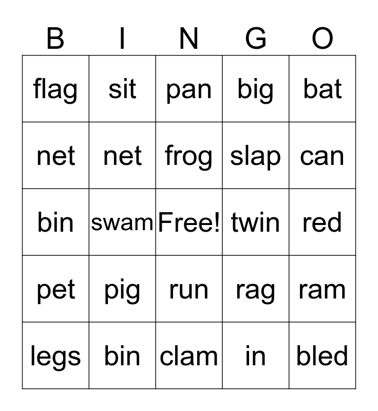 This bingo card has a free space and 24 words: pig, bin, frog, legs, bat, flag, net, sit, twin, run, slap, bin, rag, ram, net, in, red, pan, can, swam, bled, pet, big and clam.