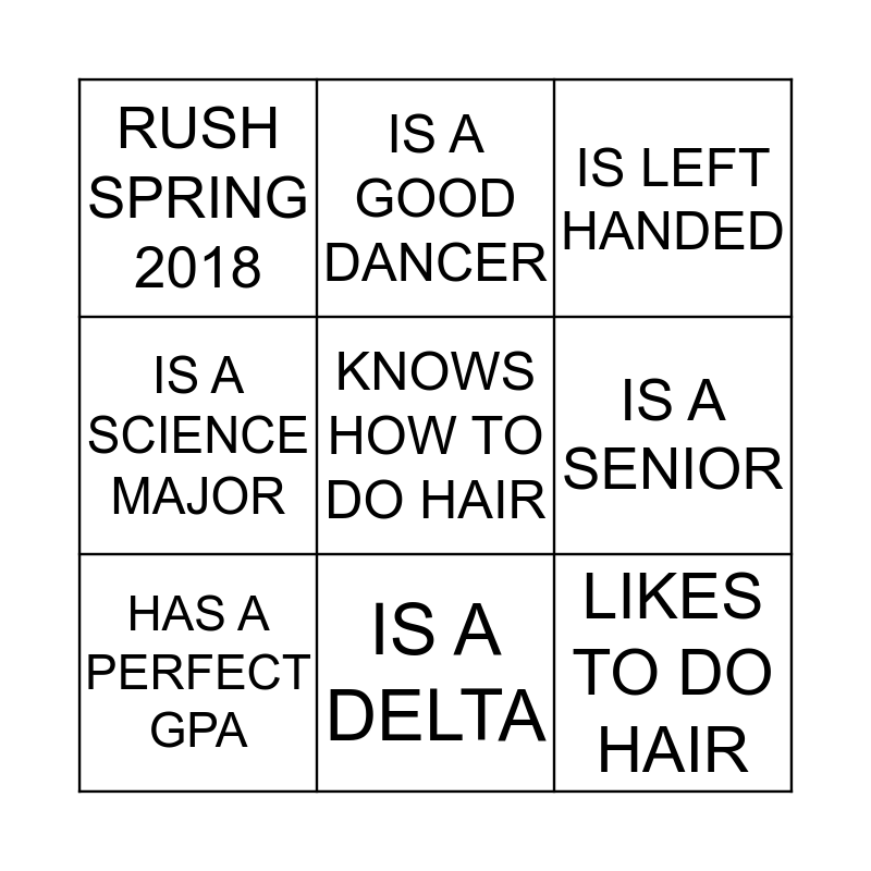 This bingo card has 9 words: HAS A PERFECT GPA, IS LEFT HANDED, IS A GOOD DANCER, IS A SCIENCE MAJOR, RUSH SPRING 2018, IS A SENIOR, KNOWS HOW TO DO HAIR, LIKES TO DO HAIR and IS A DELTA.