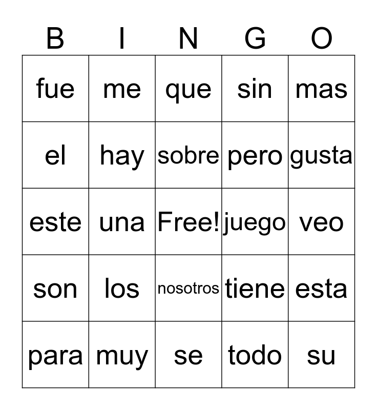 This bingo card has a free space and 24 words: los, muy, sobre, para, mas, fue, el, me, juego, nosotros, pero, este, tiene, esta, hay, todo, veo, que, gusta, una, su, son, sin and se.
