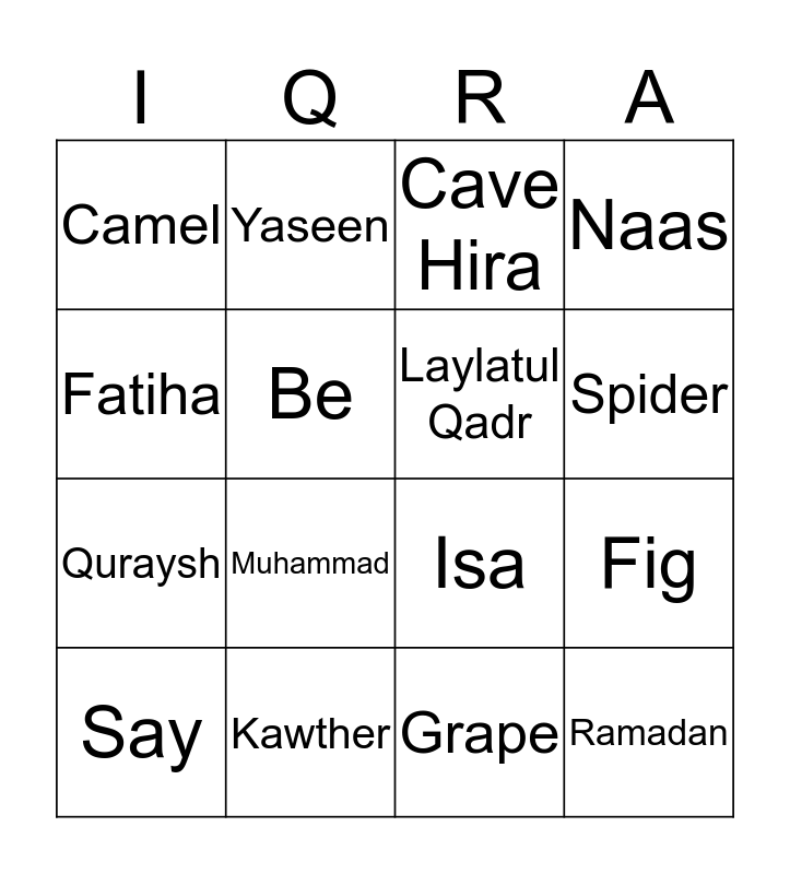This bingo card has 16 words: Kawther, Fig, Cave Hira, Camel, Quraysh, Yaseen, Isa, Grape, Fatiha, Be, Say, Naas, Muhammad, Spider, Laylatul Qadr and Ramadan.