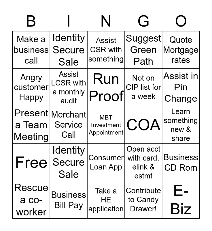 This bingo card has a free space and 24 words: Identity Secure Sale, Business Bill Pay, Run Proof, Rescue a co-worker, Quote Mortgage rates, Make a business call, Angry customer Happy, Identity Secure Sale, COA, Consumer Loan App, Not on CIP list for a week, Present a Team Meeting, Open acct with card, elink & estmt, Business CD Rom, Assist LCSR with a monthly audit, Contribute to Candy Drawer!, Learn something new & share, Assist CSR with something, Assist in Pin Change, Merchant Service Call, E-Biz, Free, Suggest Green Path and Take a HE application.