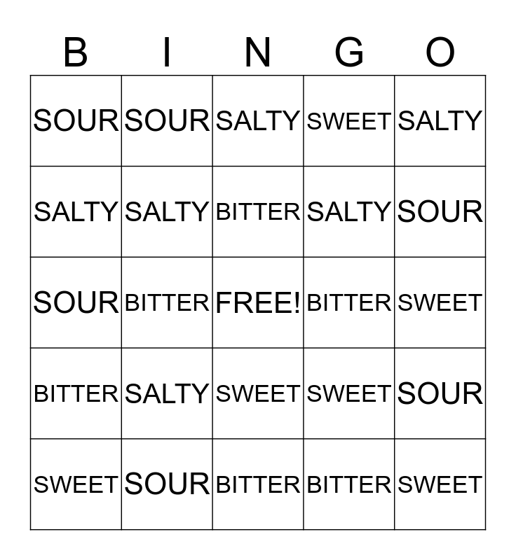 This bingo card has a free space and 24 words: SALTY, SOUR, BITTER, SWEET, SALTY, SOUR, SALTY, SOUR, BITTER, SWEET, SALTY, SOUR, SWEET, SOUR, SALTY, BITTER, SWEET, SALTY, SOUR, BITTER, SWEET, BITTER, SWEET and BITTER.