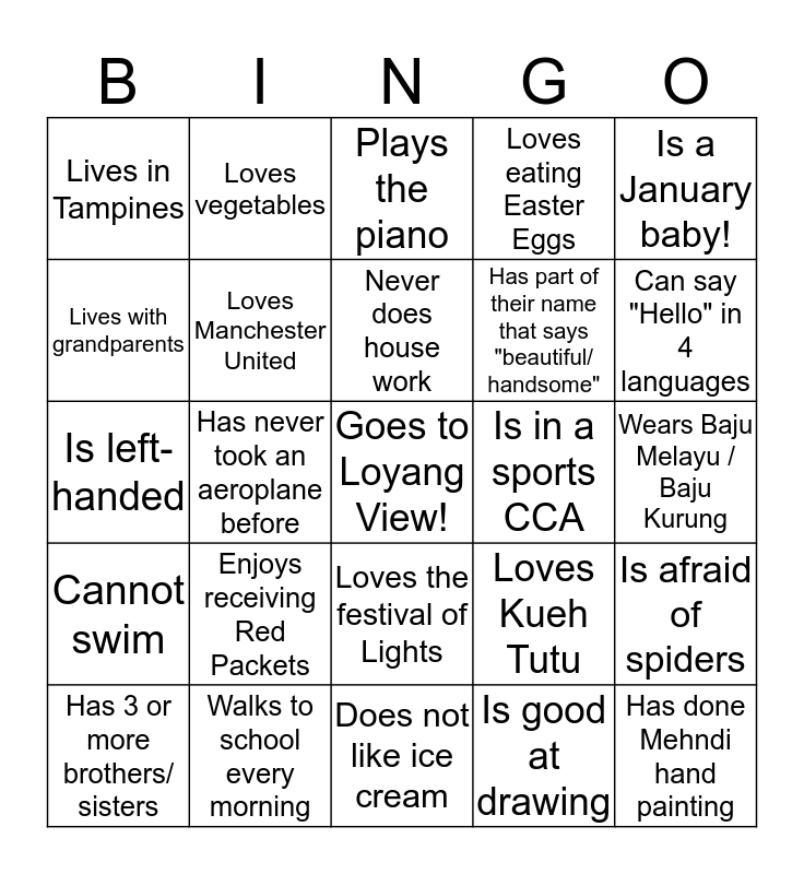 This bingo card has a free space and 24 words: Enjoys receiving Red Packets, Walks to school every morning, Never does house work, Has 3 or more brothers/ sisters, Is a January baby!, Lives in Tampines, Lives with grandparents, Loves vegetables, Is in a sports CCA, Loves the festival of Lights, Has part of their name that says "beautiful/ handsome", Is left-handed, Loves Kueh Tutu, Is afraid of spiders, Loves Manchester United, Is good at drawing, Wears Baju Melayu / Baju Kurung, Plays the piano, Can say "Hello" in 4 languages, Has never took an aeroplane before, Has done Mehndi hand painting, Cannot swim, Loves eating Easter Eggs and Does not like ice cream.