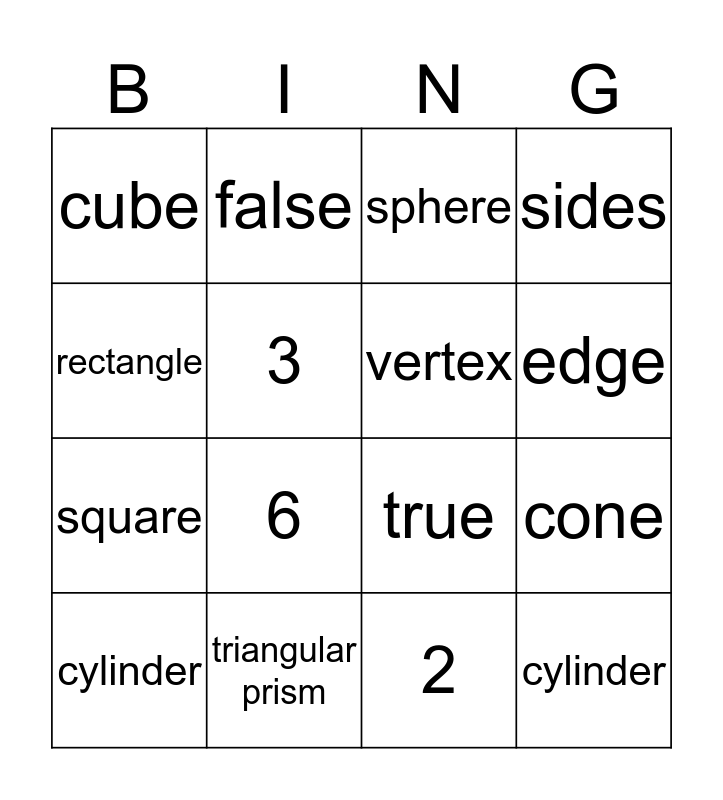 This bingo card has 16 words: triangular prism, cone, sphere, cube, square, false, true, 2, rectangle, 3, cylinder, sides, 6, edge, vertex and cylinder.