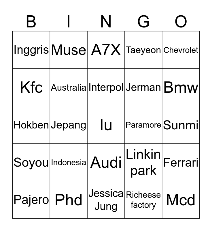 This bingo card has a free space and 24 words: Indonesia, Phd, Interpol, Pajero, Chevrolet, Inggris, Kfc, Muse, Paramore, Audi, Jerman, Hokben, Linkin park, Ferrari, Australia, Richeese factory, Sunmi, A7X, Bmw, Jepang, Mcd, Soyou, Taeyeon and Jessica Jung.