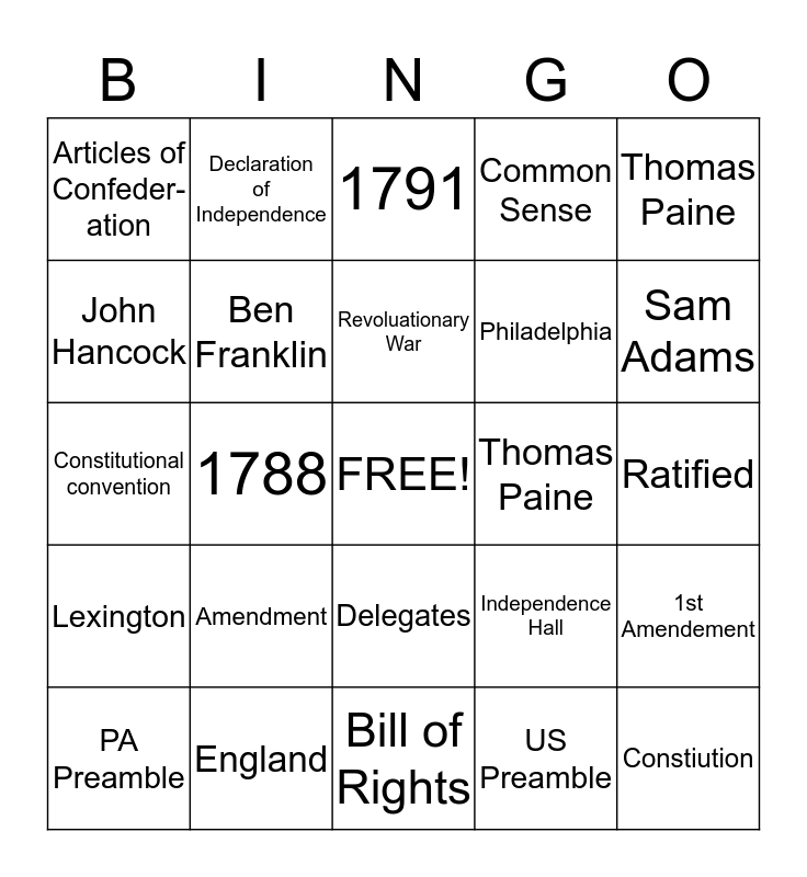 This bingo card has a free space and 24 words: Amendment, England, Revoluationary War, PA Preamble, Thomas Paine, Articles of Confeder-ation, John Hancock, Declaration of Independence, Thomas Paine, Delegates, Philadelphia, Constitutional convention, Independence Hall, 1st Amendement, Ben Franklin, US Preamble, Ratified, 1791, Sam Adams, 1788, Constiution, Lexington, Common Sense and Bill of Rights.