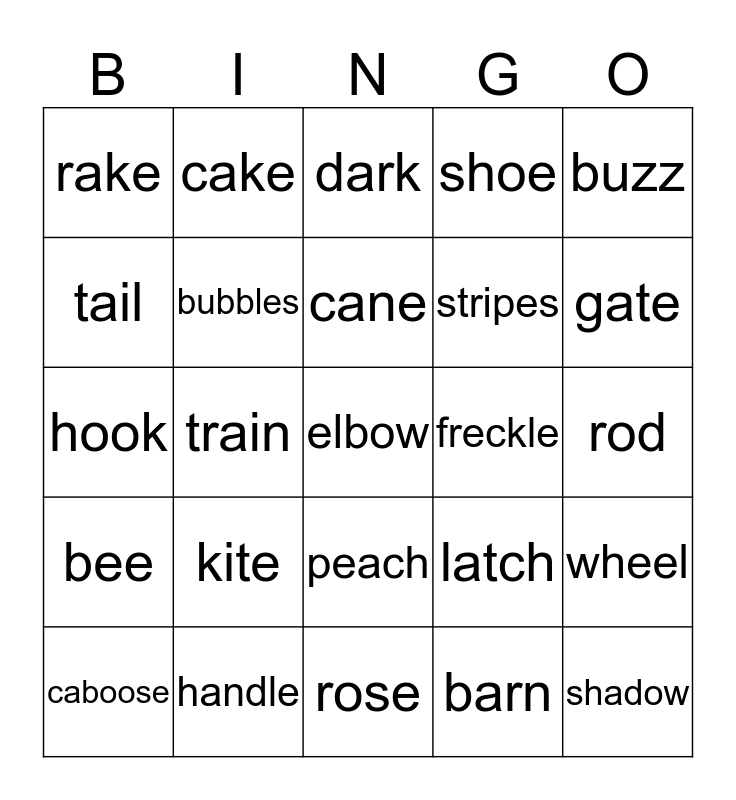 This bingo card has a free space and 34 words: arm, barn, bath, beach, bee, bubbles, buzz, caboose, cake, candles, cane, dark, farm, fish, freckle, gate, handle, hook, kite, latch, peach, pod, rake, rod, rose, shadow, shoe, skate, stripes, tail, thorn, train, wheel and night.