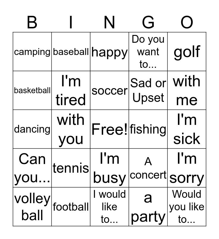 This bingo card has a free space and 24 words: tennis, football, soccer, volley ball, golf, camping, basketball, baseball, fishing, I'm busy, Sad or Upset, dancing, A concert, I'm sorry, I'm tired, a party, I'm sick, happy, with me, with you, Would you like to..., Can you..., Do you want to... and I would like to....