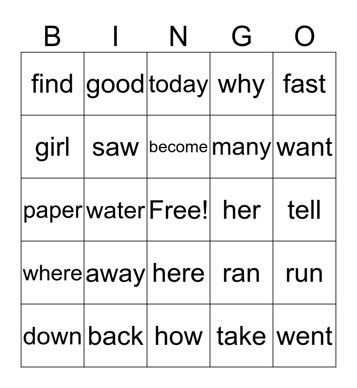 This bingo card has a free space and 24 words: away, back, become, down, fast, find, girl, good, her, here, many, paper, ran, run, saw, take, tell, today, want, water, went, where, why and how.