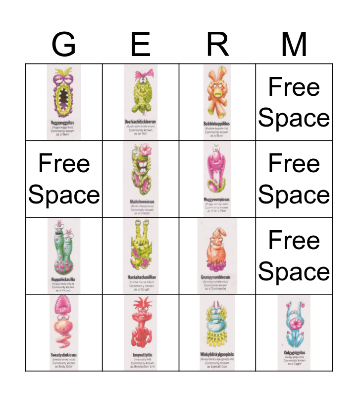 This bingo card has 12 images and 4 words: Free Space, Free Space, Free Space and Free Space.