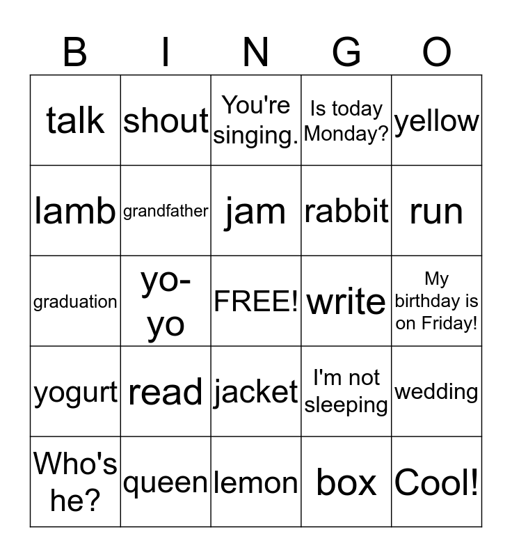 This bingo card has a free space and 39 words: How old are you?, see you tomorrow!, grandmother, grandfather, Who's he?, jacket, jam, jet, yellow, yogurt, yo-yo, Is today Monday?, Cool!, My birthday is on Friday!, write, read, sleep, talk, I'm eating., I'm not sleeping, lamb, lemon, rabbit, run, red, This is for you., You're welcome., Open it., cry, shout, laugh, We're shouting., You're singing., queen, box, duck, wedding, graduation and Mother's Day.