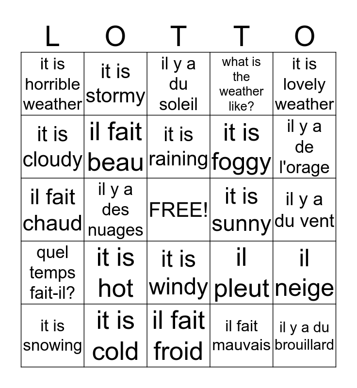 This bingo card has a free space and 24 words: it is hot, it is cold, it is raining, it is snowing, it is lovely weather, it is horrible weather, it is cloudy, it is stormy, it is sunny, it is windy, it is foggy, il fait chaud, il pleut, il neige, il fait beau, il fait mauvais, il y a du vent, il y a du soleil, il y a de l'orage, il y a des nuages, il y a du brouillard, quel temps fait-il?, what is the weather like? and il fait froid.
