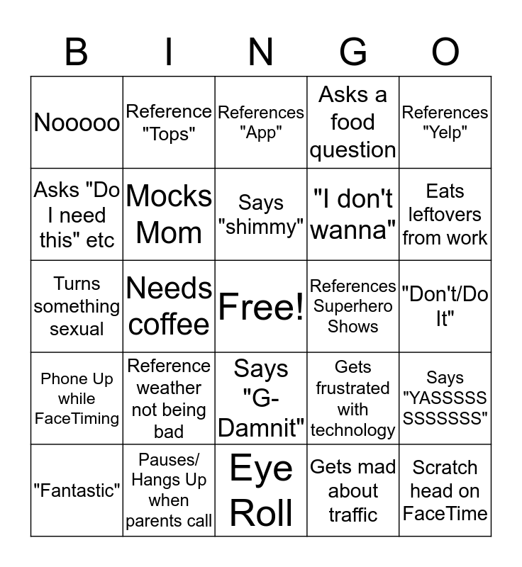 This bingo card has a free space and 24 words: "Fantastic", Reference weather not being bad, Says "shimmy", Gets mad about traffic, References "Yelp", Nooooo, Reference "Tops", References "App", References Superhero Shows, "Don't/Do It", Turns something sexual, Mocks Mom, Gets frustrated with technology, Says "YASSSSS SSSSSSS", Asks "Do I need this" etc, Pauses/ Hangs Up when parents call, Eye Roll, Asks a food question, Eats leftovers from work, Phone Up while FaceTiming, Needs coffee, Says "G- Damnit", "I don't wanna" and Scratch head on FaceTime.