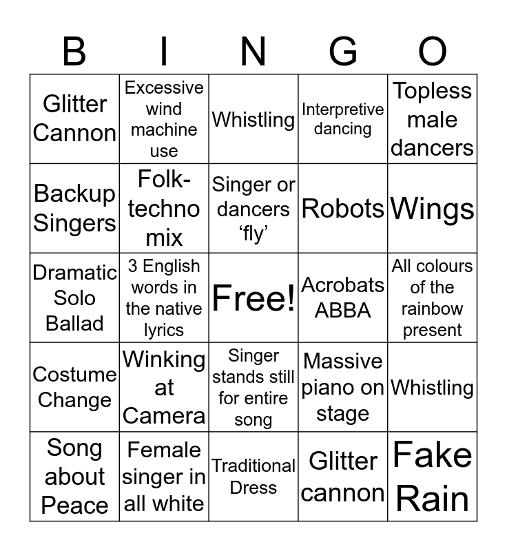 This bingo card has a free space and 28 words: Whistling, Opera-like song, Robots, Glitter cannon, Backup Singers, Whistling, Excessive wind machine use, Costume Change, Acrobats ABBA, Song about Peace, Dramatic Solo Ballad, Interpretive dancing, Female singer in all white, Traditional Dress, Wings, Capes, Winking at Camera, Folk-techno mix, Singer or dancers ‘fly’, Singer stands still for entire song, Glitter Cannon, Song in bad English, Fake Rain, 3 English words in the native lyrics, All colours of the rainbow present, Massive piano on stage, Topless male dancers and Uses Treadmill.