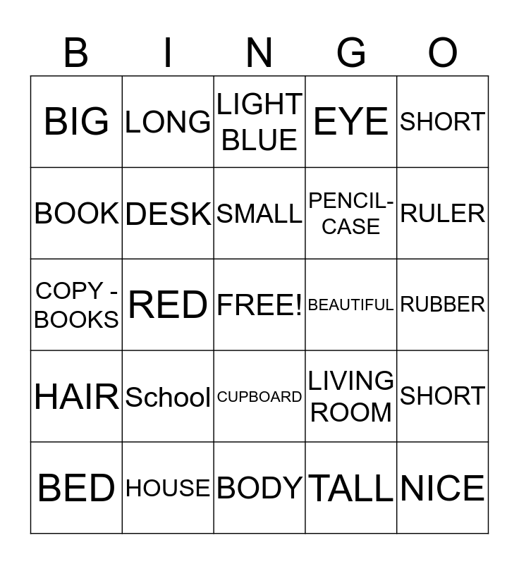 This bingo card has a free space and 24 words: School, HOUSE, SMALL, BED, SHORT, BIG, BOOK, LONG, BEAUTIFUL, CUPBOARD, PENCIL-CASE, COPY -BOOKS, LIVING ROOM, SHORT, DESK, TALL, RUBBER, LIGHT BLUE, RULER, RED, NICE, HAIR, EYE and BODY.