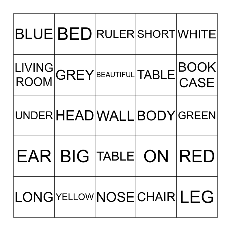 This bingo card has a free space and 24 words: BIG, YELLOW, BEAUTIFUL, LONG, WHITE, BLUE, LIVING ROOM, BED, BODY, TABLE, TABLE, UNDER, ON, RED, GREY, CHAIR, GREEN, RULER, BOOK CASE, HEAD, LEG, EAR, SHORT and NOSE.
