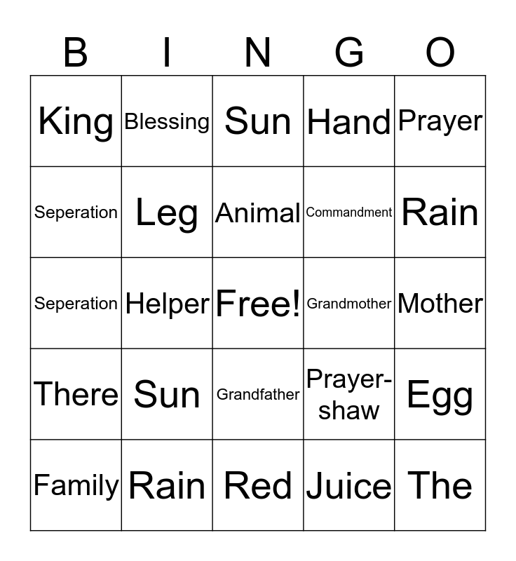 This bingo card has a free space and 24 words: Sun, Rain, Animal, Family, Prayer, King, Seperation, Blessing, Grandmother, Grandfather, Commandment, Seperation, Prayer- shaw, Egg, Leg, Juice, Mother, Sun, Rain, Helper, The, There, Hand and Red.
