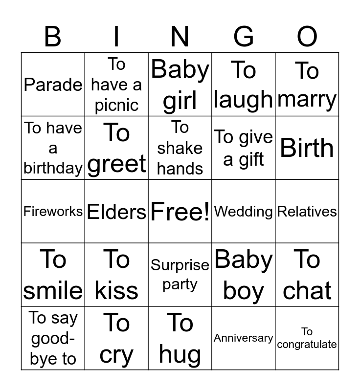This bingo card has a free space and 24 words: To kiss, To cry, To shake hands, To say good-bye to, To marry, Parade, To have a birthday, To have a picnic, Wedding, Surprise party, To give a gift, Fireworks, Baby boy, To chat, To greet, Anniversary, Relatives, Baby girl, Birth, Elders, To congratulate, To smile, To laugh and To hug.