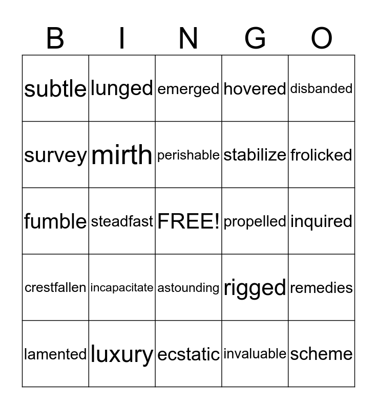 This bingo card has a free space and 24 words: incapacitate, luxury, perishable, lamented, disbanded, subtle, survey, lunged, propelled, astounding, stabilize, fumble, rigged, remedies, mirth, invaluable, inquired, emerged, frolicked, steadfast, scheme, crestfallen, hovered and ecstatic.