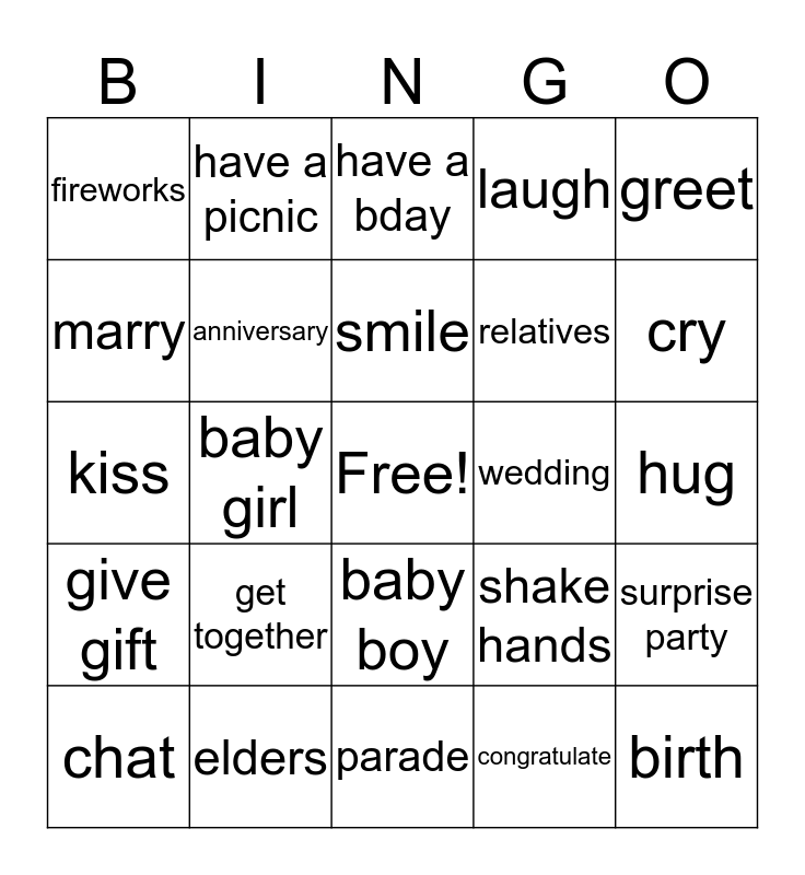 This bingo card has a free space and 24 words: get together, elders, smile, chat, greet, fireworks, marry, have a picnic, wedding, baby boy, relatives, kiss, shake hands, surprise party, anniversary, congratulate, hug, have a bday, cry, baby girl, birth, give gift, laugh and parade.